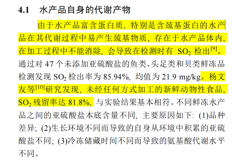 学术论文《水产品中二氧化硫残留量的调查分析》同样指出,水产品中二氧化硫可能来源于自身代谢产品。“由于水产品富含蛋白质, 特别是含巯基蛋白的水产品在其代谢过程中易产生巯基物质, 存在于水产品体内, 在加工过程中不能消除, 会导致在检测时有SO₂检出。”