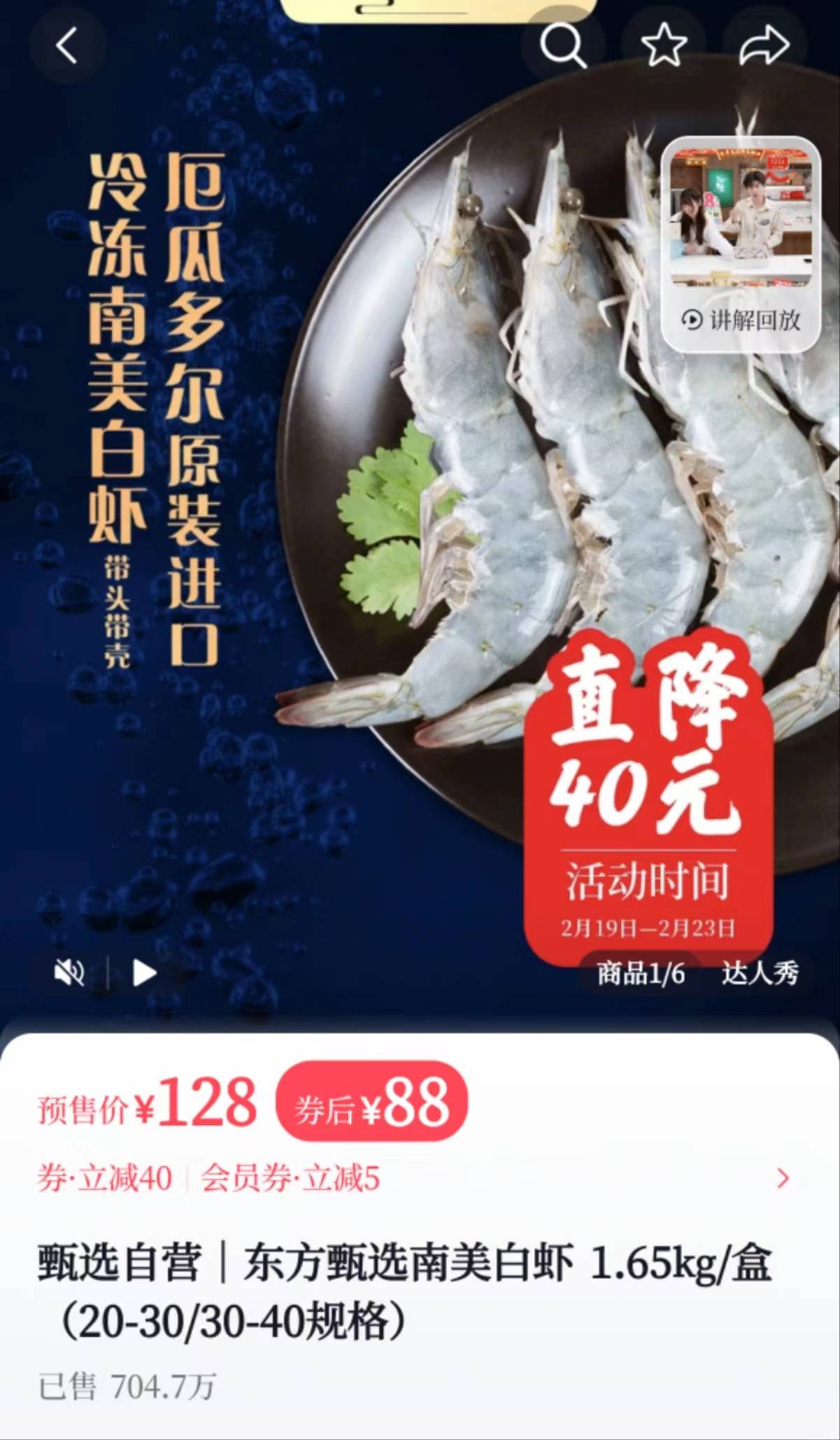 搜狐财经发现,遭打假的南美白虾目前仍在东方甄选天猫、抖音官方店铺正常售卖。其中,抖音界面显示,该款产品分为20-30、30-40两种规格,均为1.65kg/盒,券后价分别为98元、88元,当前已售704.7万。