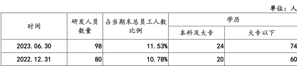 从研发人员队伍素质来说,虽然报告期内美新科技的研发人员数量在持续增长,但高学历人员始终占据少数。如报告期末的2023年上半年,公司研发人员中本科及大专学历仅有24人,而大专以下学历则有74人,这样的研发人员队伍素质很难相信企业未来会有什么像样的研发成果出来。