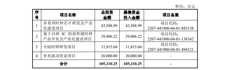 大普技术本次IPO保荐机构为海通证券股份有限公司,计划发行不超过2071万股,拟募集资金投入金额为10.531亿元,将投资于多系列时钟芯片研发及产业化建设项目(4.359亿元)、基于自研IC的高性能时钟产品开发及产业化建设项目(2.991亿元)、全硅时钟研发项目(1.182亿元)、补充流动资金项目(2亿元)。