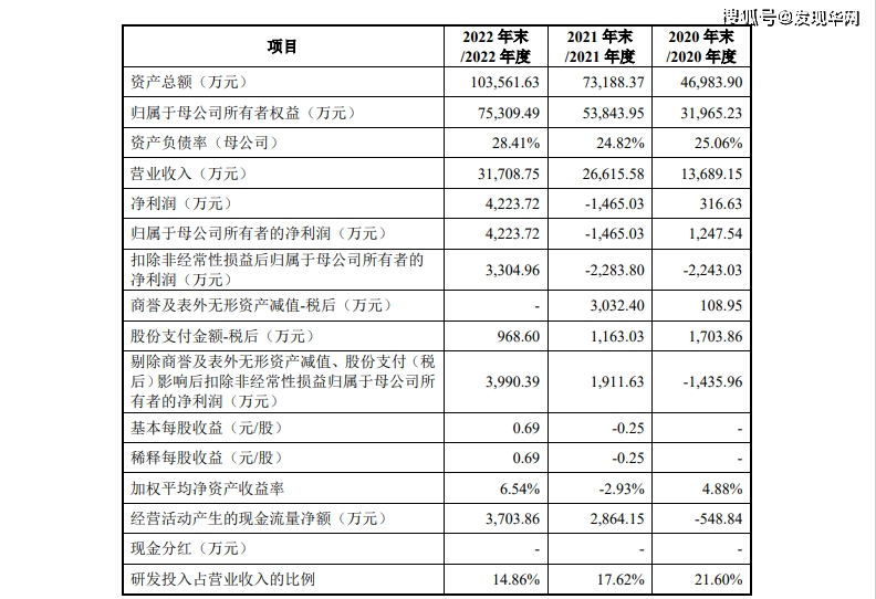 2020年度、2021年度、2022年度(以下简称报告期内),公司的营业收入分别为1.369亿元、2.662亿元、3.171亿元,营业收入持续增长,然而净利润方面却不尽如人意,各期净利润分别为316.63万元、-1465.03万元、4223.72万元,扣非后归母净利润分别为-2243.03万元、-2283.80万元、3304.96万元。2020年和2021年盈利方面连续亏损,其中2021年在营业收入同比增幅94.43%的情况下,净利润却下滑了56.27%,出现增收不增利的现象,公司的盈利能力遭遇市场质疑。