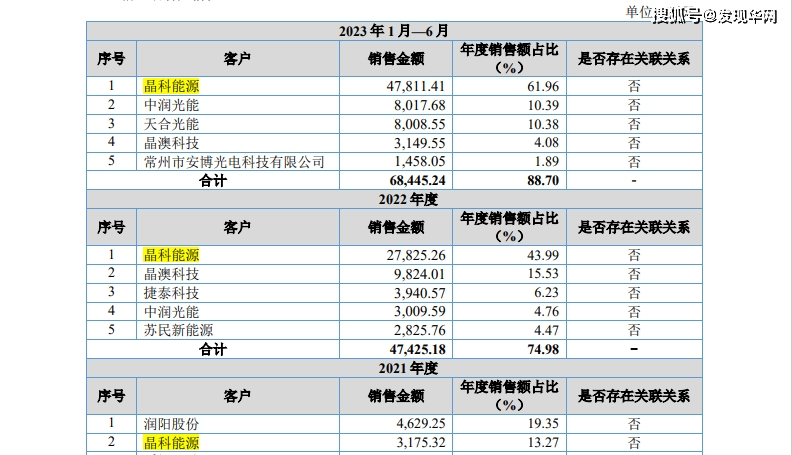 其中晶科能源股份有限公司(简称“晶科能源”)作为天盛股份现阶段最大客户之一,主要从公司采购银浆、铝浆。报告期内,公司来自晶科能源的销售收入占各期营业收入比例分别为12.39%、13.27%、43.99、61.96,同样呈大幅度上升的态势,2023年上半年占比超过50%,公司对晶科能源存在重大依赖,这种依赖带来的风险也在不断加大。