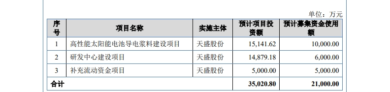天盛股份于2016年实现“新三板”挂牌上市,本次“转板”拟公开发行不超过920万股,计划募集资金2.1亿元,分别投入高性能太阳能电池导电浆料建设项目1亿元、研发中心建设项目6000万元、补充流动资金项目5000万元。保荐机构为东方证券承销保荐有限公司。