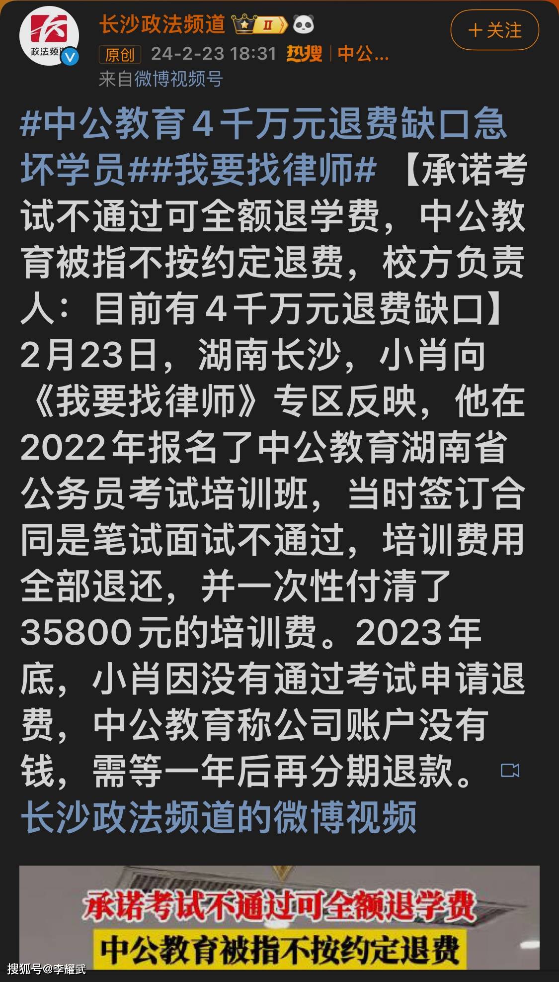 2月23日,湖南长沙,小肖向《我要找律师》专区反映,他在2022年报名了中公教育湖南省公务员考试培训班,当时签订合同是笔试面试不通过,培训费用全部退还,并一次性付清了35800元的培训费。2023年底,小肖因没有通过考试申请退费,中公教育称公司账户没有钱,需等一年后再分期退款。
