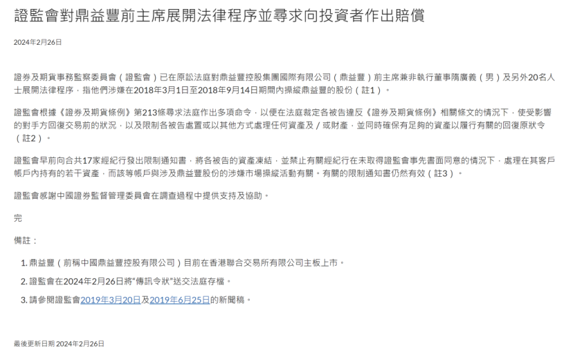 2月26日,香港证监会宣布已在原讼法庭对鼎益丰控股集团国际有限公司(鼎益丰)前主席兼非执行董事隋广义及另外20名人士展开法律程序,指他们涉嫌在2018年3月1日至2018年9月14日期间操纵鼎益丰的股份。