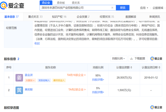 爱企查显示,丰源芯公司实缴资本5000万元,经营范围包括电子产品、金属材料及制品购销、可重组逻辑芯片的技术开发、技术服务、咨询、投资咨询、房地产经纪、兴办实业等。