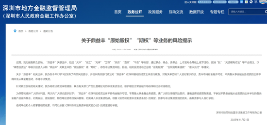 去年,深圳地方金融局曾多次发布关于鼎益丰“原始股权”“期权”等业务的风险提示。
