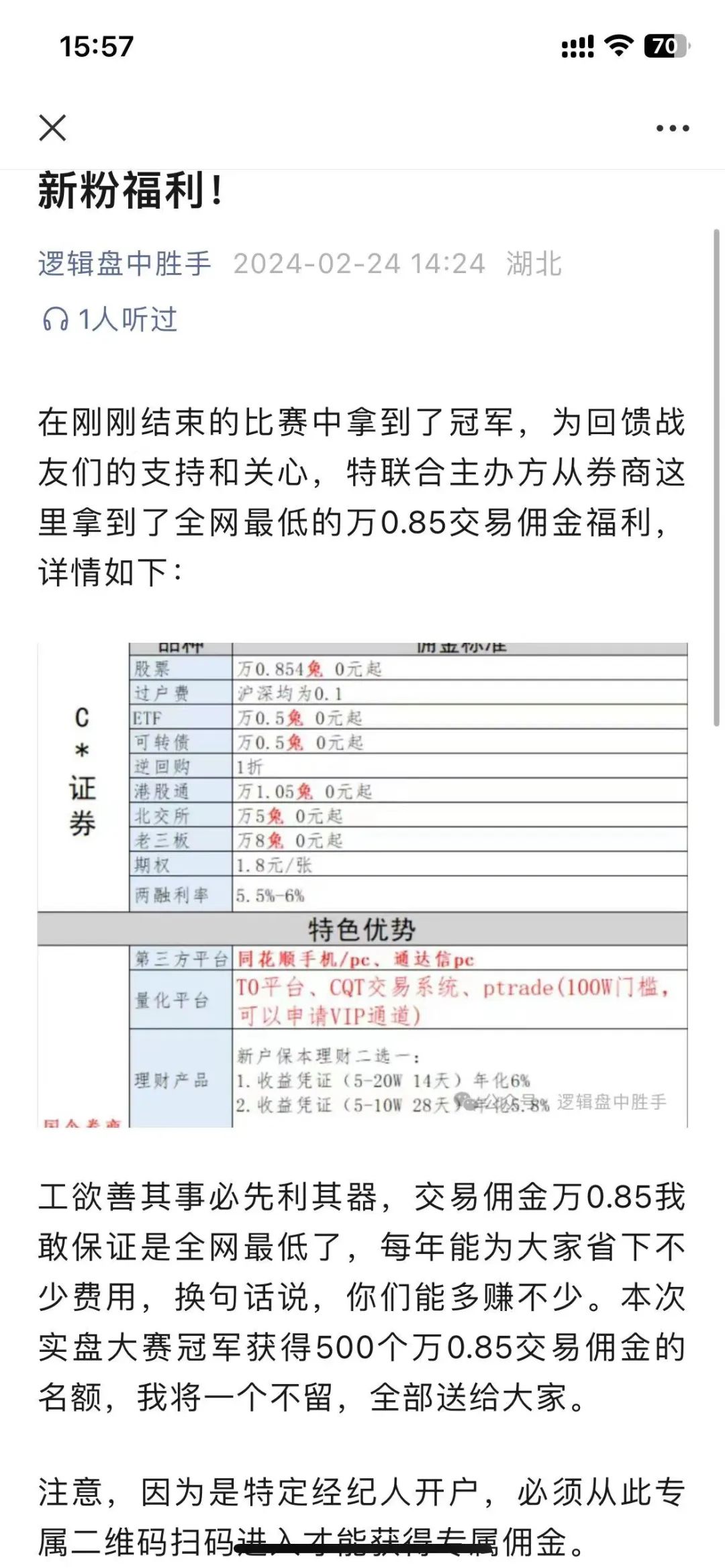 不过,“勇敢铁牛”在文中引流的另一公众号“逻辑盘中胜手”仍存在,该账号的认证主体为西咸新区沣东新城泽富特百货店(个体工商户),经营范围同为零售用品。“逻辑盘中胜手”一直在向粉丝分享实盘,在其2月24日发表的文章中,还以低佣金引导粉丝扫二维码开户。