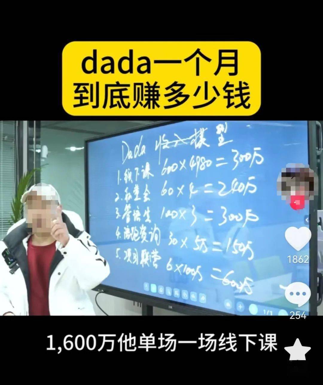 据此计算,一场线下课总收入能有一千六百万左右。而dada每个月举办一场线下课,年收入就过亿。