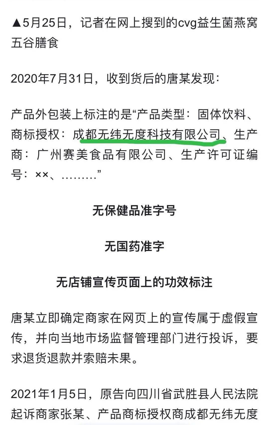 此前,有报道称,一位消费者购买了CVG的产品后发现其虚假宣传,起诉后获得三倍赔偿。