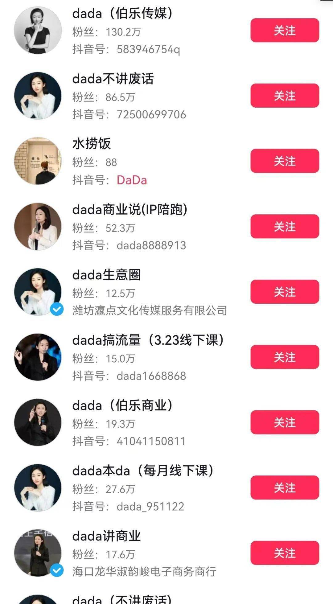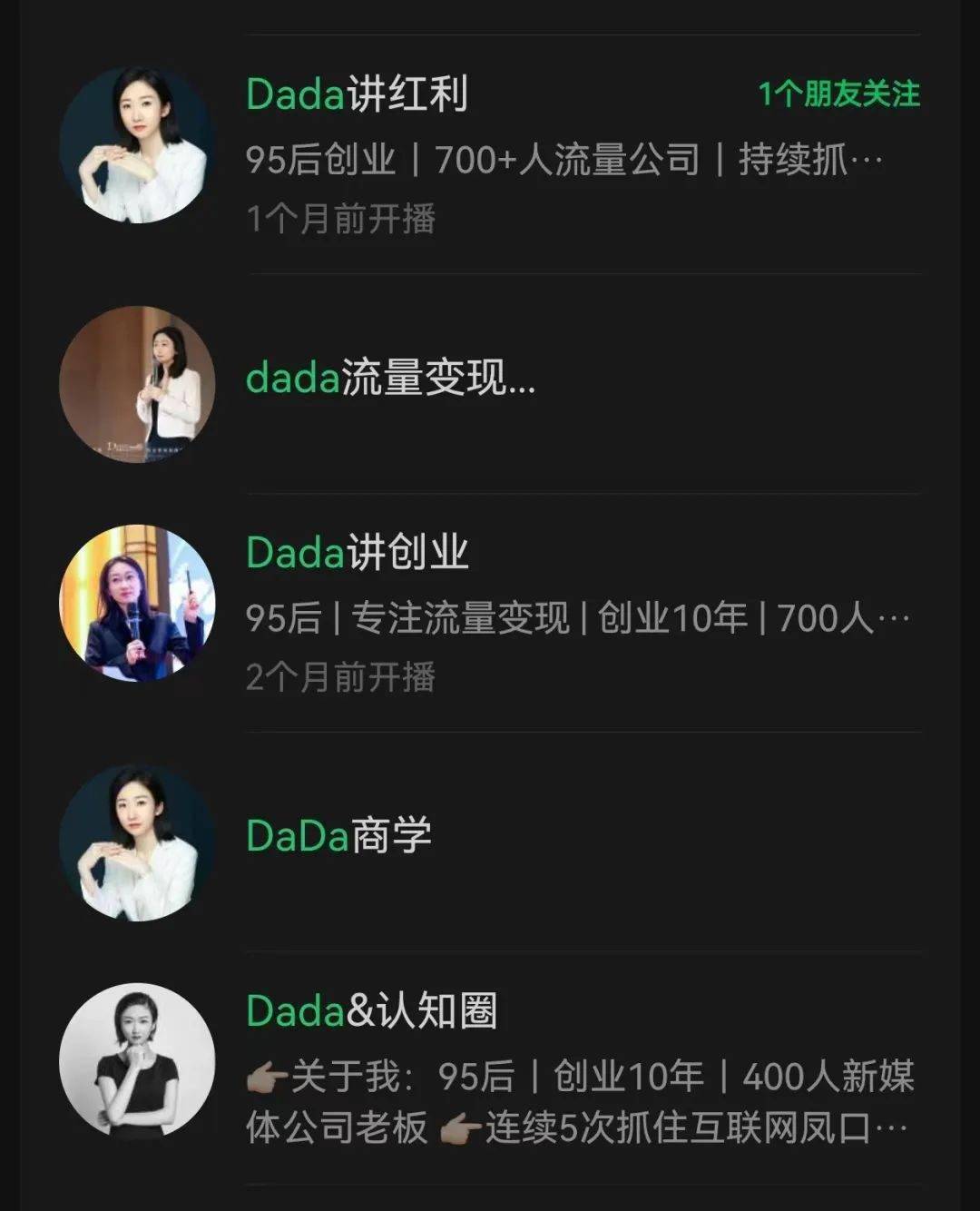 过去一年中,各短视频平台上出现成百上千个dada的切片账号,内容则全部是她谈自己如何成功、各种商业见解、人生观分享等视频。相信大家和笔者一样,这段时间动不动就刷到dada的视频。