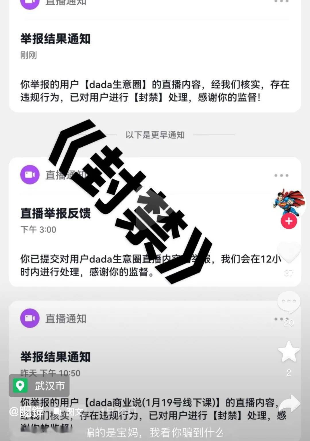 现在,网上出现大量质疑dada涉嫌传销的声音,还有网友晒出举报dada直播且一些账号被封的截图,那么她是不是翻车暴雷了呢?