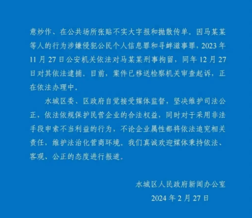 2月27日凌晨,贵州六盘水市水城区委宣传部微信公众号“水城融媒”就上述报道反映问题发布情况通报。通报称,“六盘水市水城区政府共欠企业约2.2亿元”,以及“区里要以1200万元化解所有2亿余元的债务”的报道均不属实。通报还称,报道中的女企业家马某某等人的行为涉嫌侵犯公民个人信息罪和寻衅滋事罪,已于2023年11月27日被刑事拘留,同年12月27日被依法逮捕。目前案件已移送检察机关审查起诉,正在依法办理中。同时,通报的回应聚焦在当地债务情况及马某某等人被拘留缘由上,而对于报道中反映的代理债务执行的律师、律师助理等10余人被刑事拘留,政府平台公司涉嫌从两家国有银行骗取贷款5.8亿元等关键问题没有作出回应。