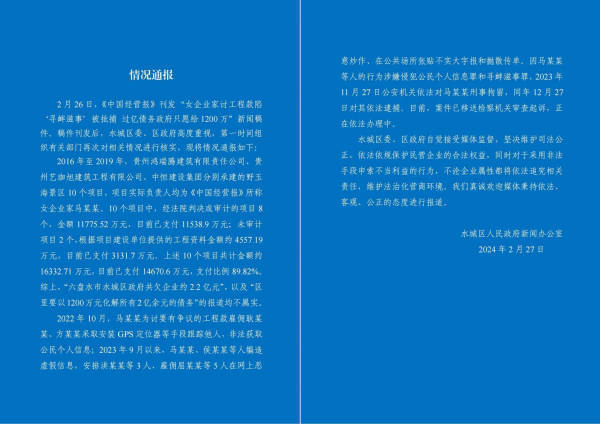 针对相关报道,2月27日凌晨,贵州六盘水市水城区人民政府新闻办公室发布情况通报。通报称,“六盘水市水城区政府共欠企业约2.2亿元”,以及“区里要以1200万元化解所有2亿余元的债务”的报道均不属实。