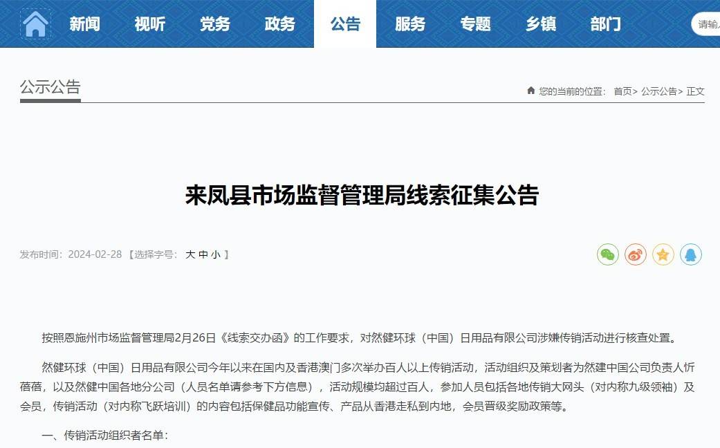 近日,湖北省恩施州来凤县市场监管局发布《线索征集公告》称,按照恩施州市场监督管理局2月26日《线索交办函》的工作要求,对然健环球(中国)日用品有限公司(以下简称“然健环球”)涉嫌传销活动进行核查处置。
