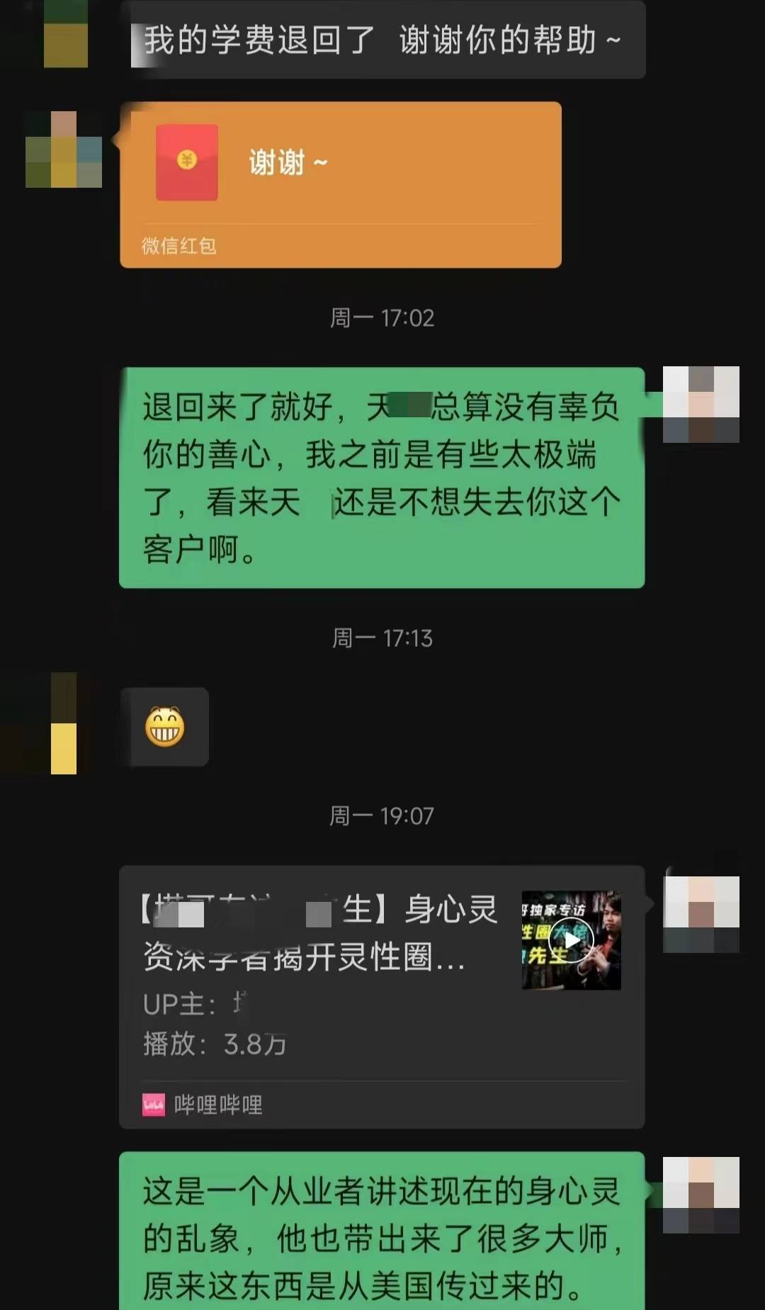 出于不忍,杨先生曾解救过一位被“洗脑”成功交纳10万元参与高阶课程的女学员,好在女学员及时醒悟顺利在开课前退回了学费。