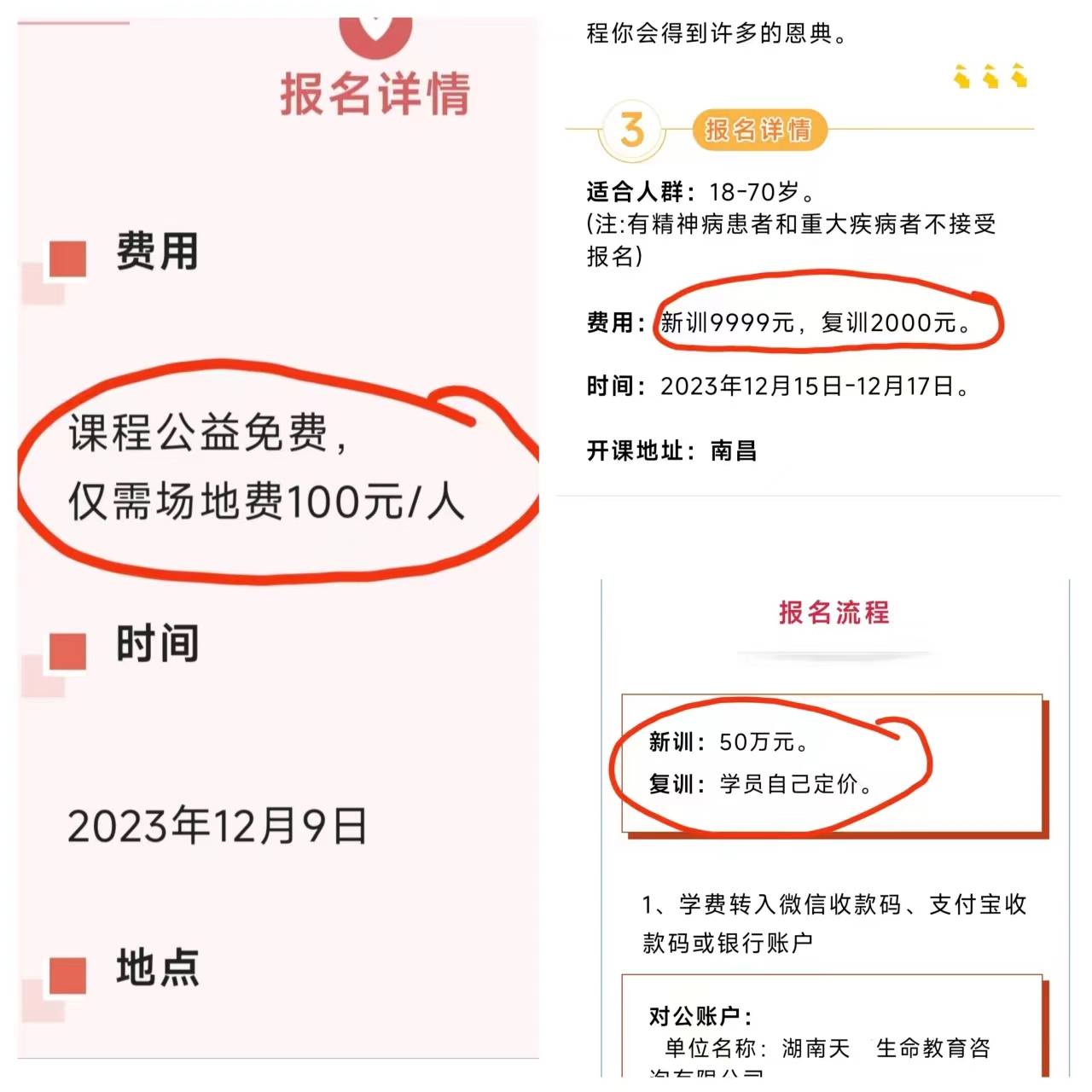 然而,这些所谓的“积福发愿”的分享会虽然号称免费参与,却需要100元每人的场地费用。而各种训练课程更是价格不菲,新训从9999元至50万元不等,复训时还要继续交纳学费。