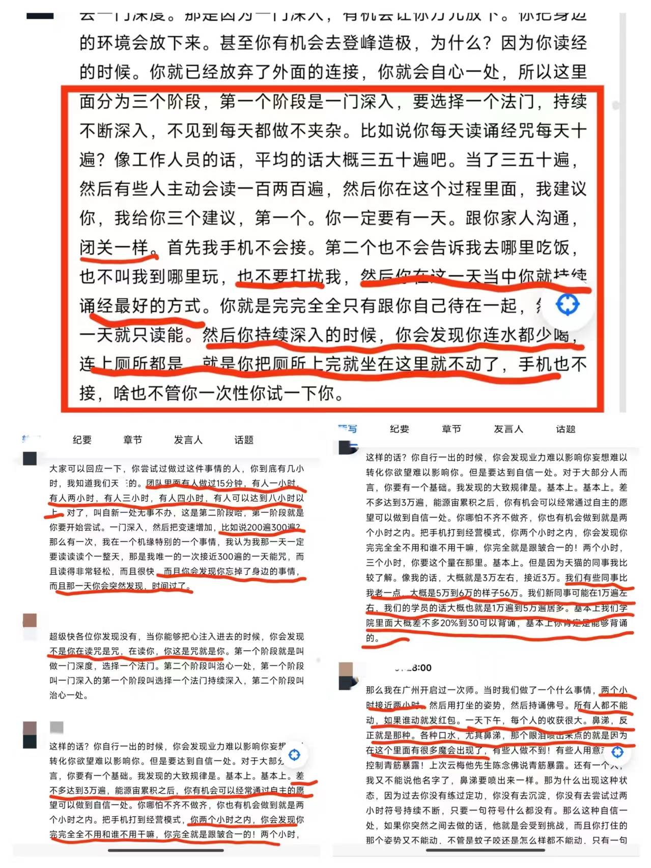 在曾经的一场2个小时的诵经会中,讲师要求学员一动不动只念咒语,众多学员念得青筋暴起、鼻涕口水直流,但讲师却表示这是因为大家定力不够、“魔”显现了,并要求学员继续不断尝试才能与咒语万念合一。