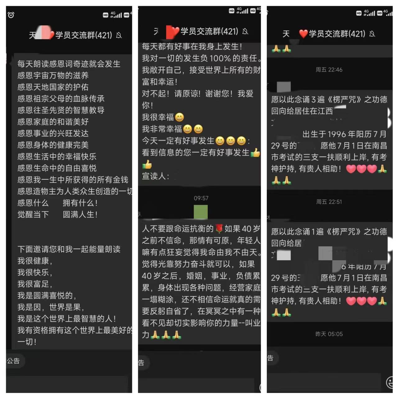 就这样,很多学员每天在讲师的引导下在群里念咒,将考试上岸、婚姻美满等全部寄托在念咒上面。