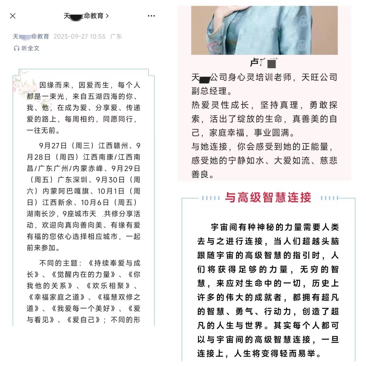 2023年8月,“天某生命”的总公司——“湖南天某生命教育咨询有限公司”被当地市场监督管理局以发布与事实不符的广告内容为由,行政处罚10万元,并该公司于2014年1月已被注销。但不知是否还有学员仍旧深陷其中,尚未醒悟。