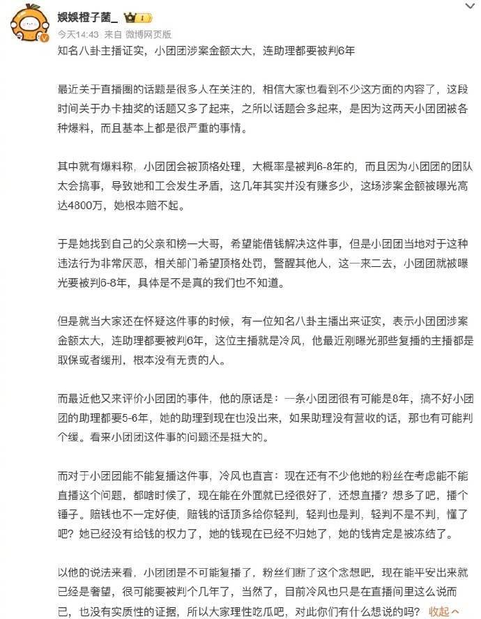 此前,斗鱼主播小团团发布视频宣布停播,并表示自己并不知道要停播多久。今日博主@娛娛橙子菌 爆料斗鱼主播小团团涉案金额太大,连助理都要被判6年,目前来看短期内小团团是不可能复播了。