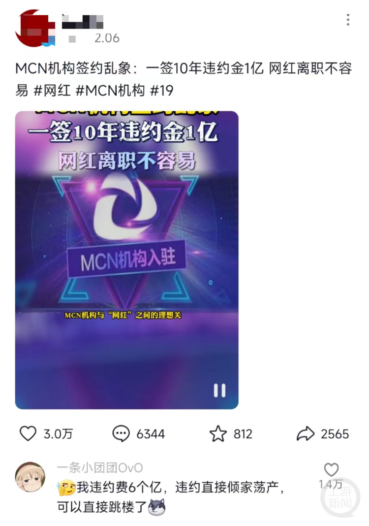 值得一提的是,2021年底,当时停播将近一个月的“一条小团团”出现抖音某视频评论区。短视频内容是“MCN签约乱象被披露,一签就10年违约金1亿”,小团团在评论区写道:“我违约费6个亿,违约直接倾家荡产,可以直接跳楼了。”