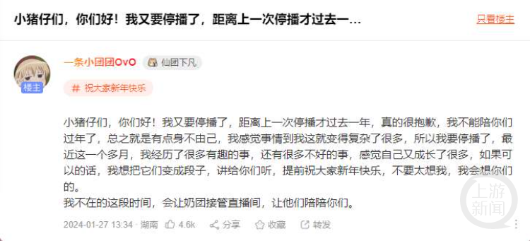 今年1月27日,“一条小团团”在斗鱼鱼吧发帖表示,“小猪仔们,你们好!我又要停播了,距离上一次停播才过去一年,真的很抱歉,我不能陪你们过年了,总之就是有点身不由己,我感觉事情到我这就变得复杂了很多,所以我要停播了,最近这一个多月,我经历了很多有趣的事,还有很多不好的事,感觉自己又成长了很多,如果可以的话,我想把它们变成段子,讲给你们听,提前祝大家新年快乐,不要太想我,我会想你们的。我不在的这段时间,会让奶团接管直播间,让他们陪陪你们。”发布这条动态后,小团团再也没有任何新动静,直到最近几天被传可能面临牢狱之灾。