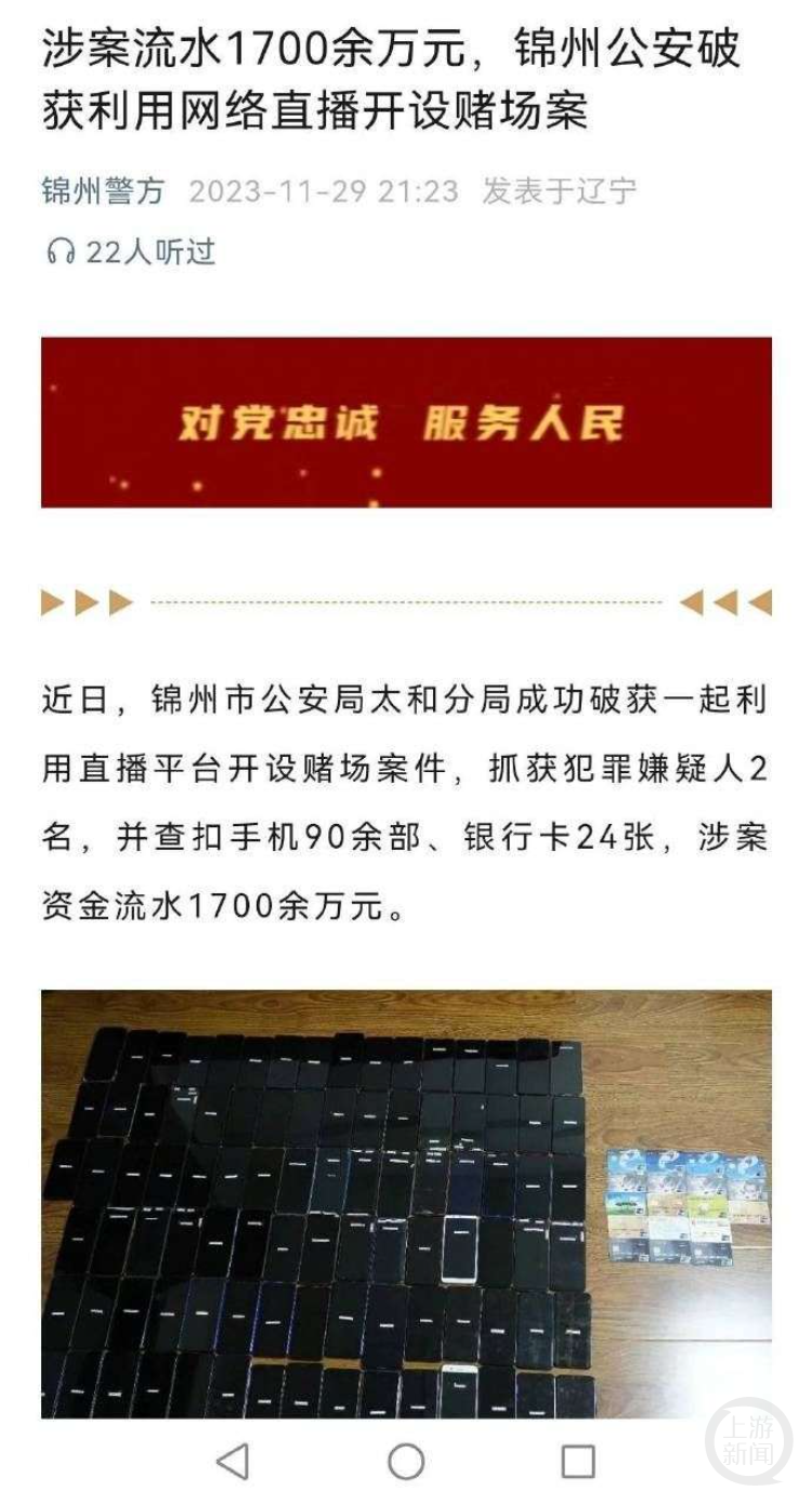 有媒体报道,斗鱼平台不少知名主播也接受了调查。去年11月底,“锦州警方”微信公众号发布文章《涉案流水1700余万元,锦州公安破获利用网络直播开设赌场案》。文中介绍,锦州市太和分局成功破获一宗在直播平台上开设赌场的案件,抓获了两名犯罪嫌疑人,查扣了90余部手机和24张银行卡,案件涉及的资金流水高达1700余万元。其中,犯罪嫌疑人周某是某平台“吃鸡”游戏主播,“2019年2月至2022年1月期间,为提升直播间热度、增加收入,周某在直播间内向观众大肆介绍利用直播间抽奖模块实施赌博玩法,并煽动观看直播人员参与其中。在游戏结束后,根据投注情况,对中奖人员给予返利。”