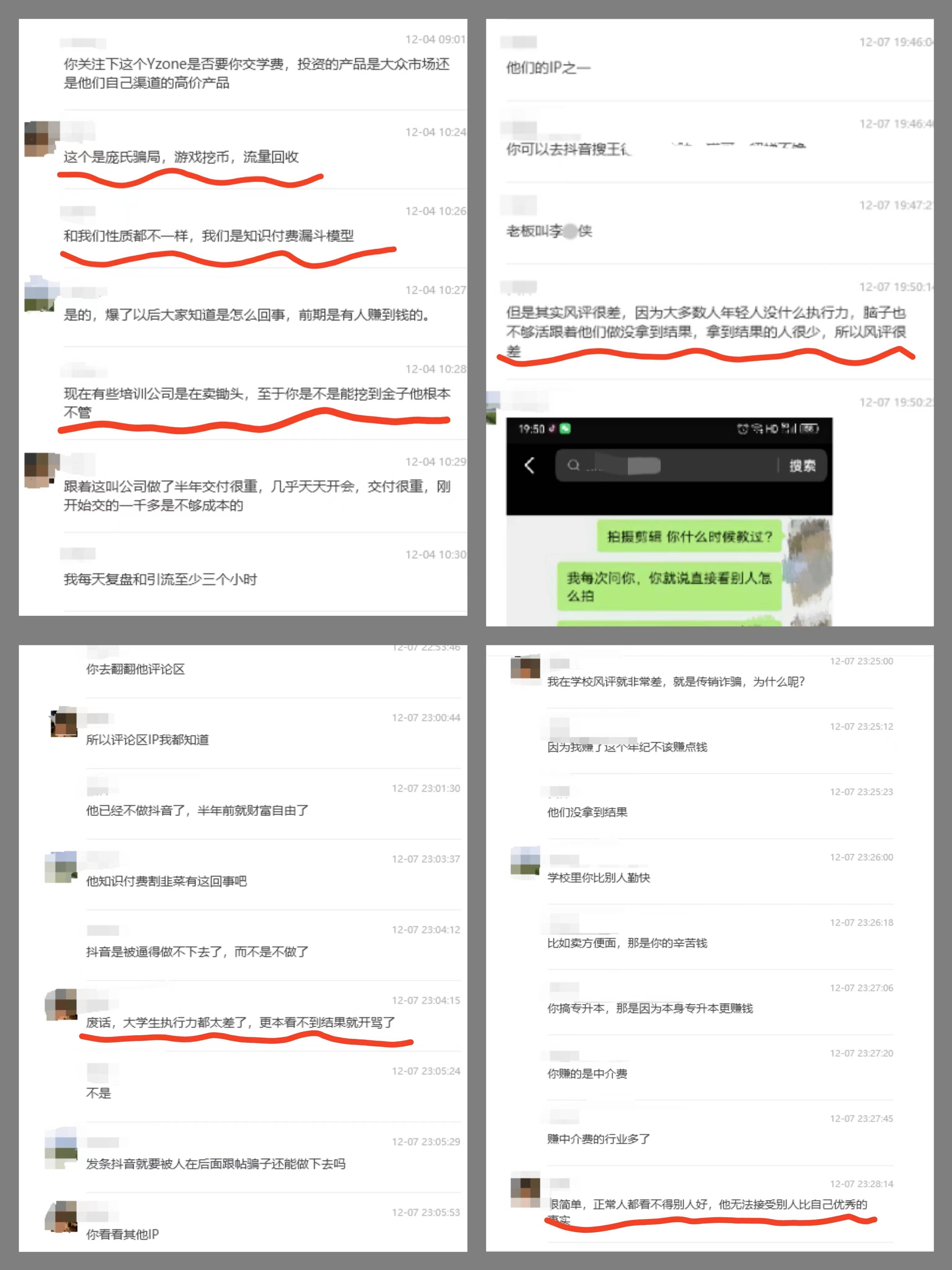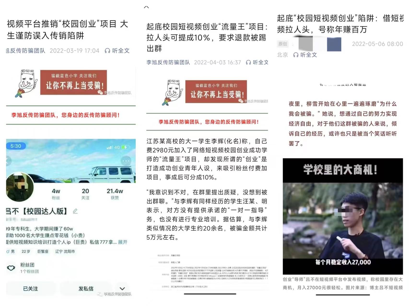 近日,多名网友向李旭反传防骗团队反映自己或朋友接触到了各种短视频课程,有的差点被卷进传销,有的不断交钱却什么也没学到,还有的正在协商退费却困难重重……