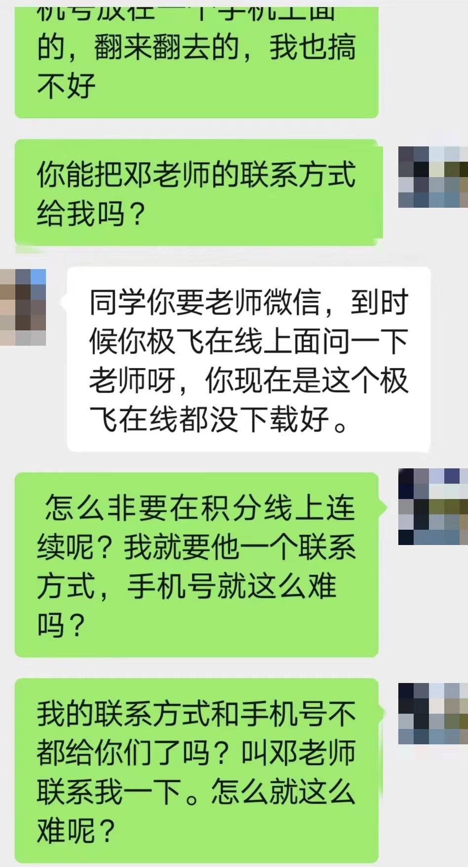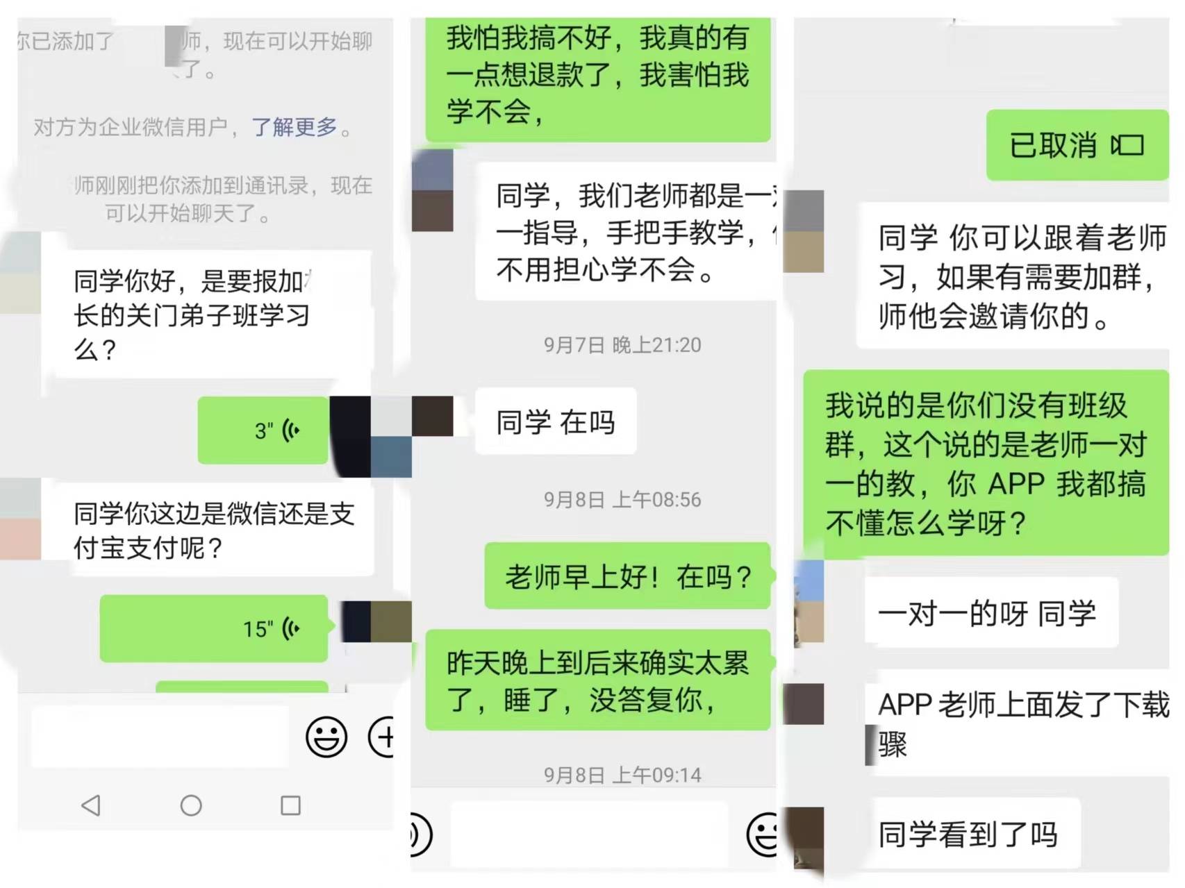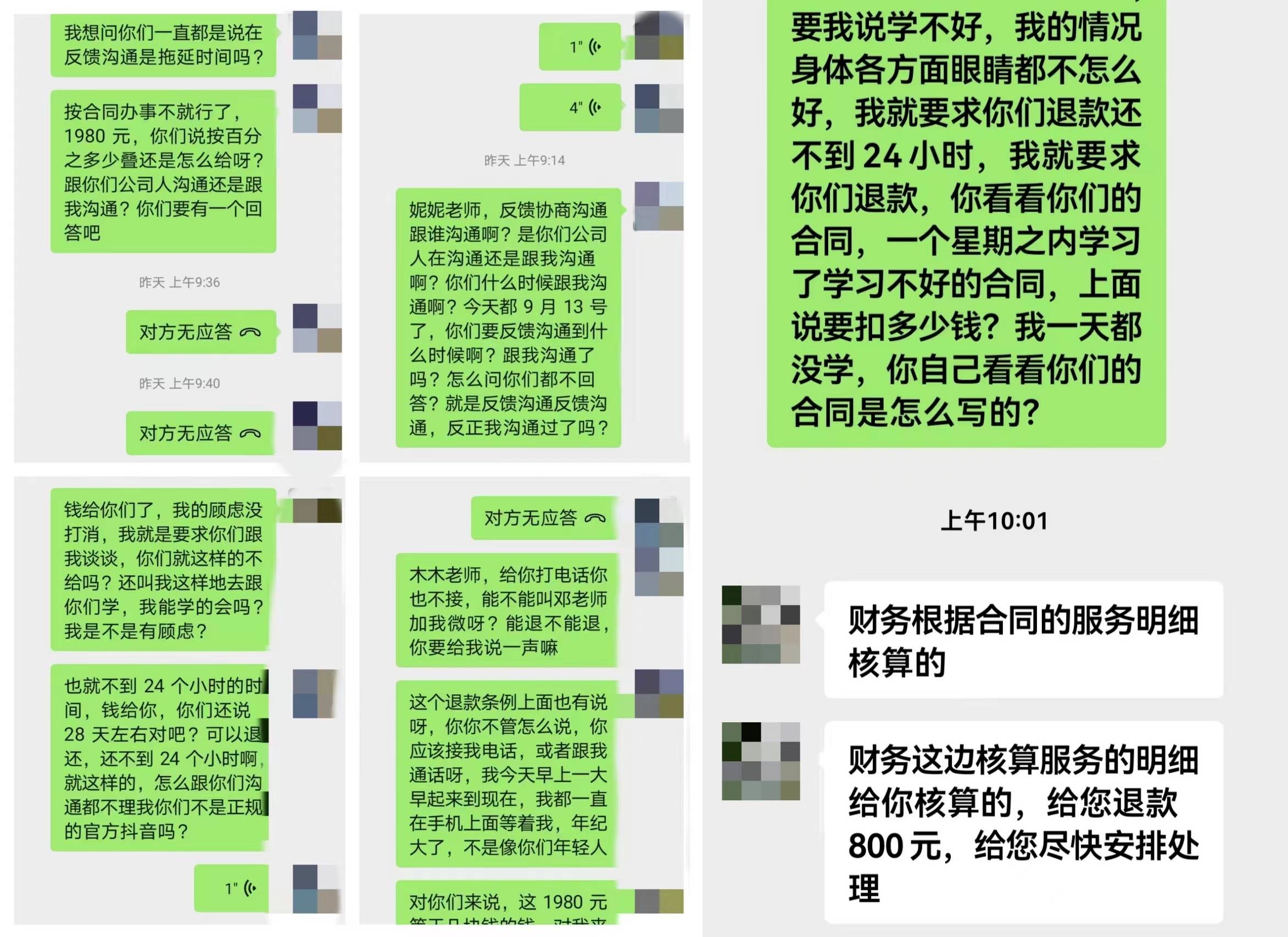 沈先生随即要求退费,老师却说她没权限,要求沈先生联系报名老师,可报名老师却一直无法联系。