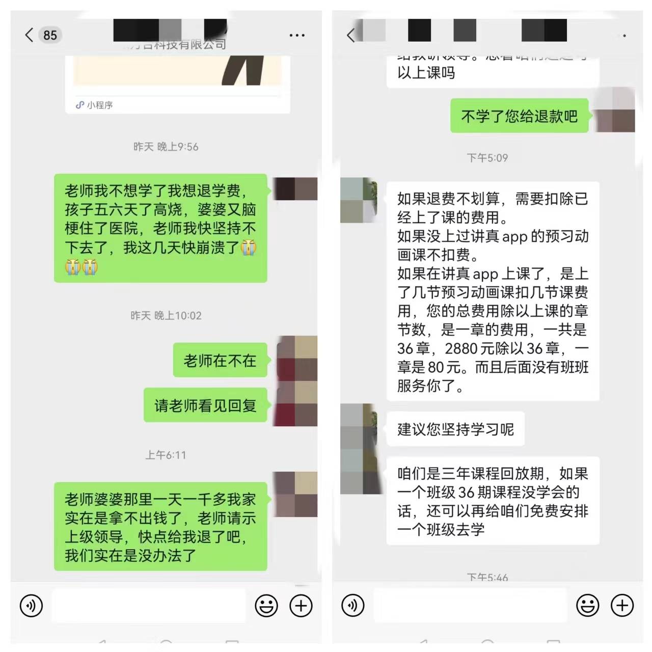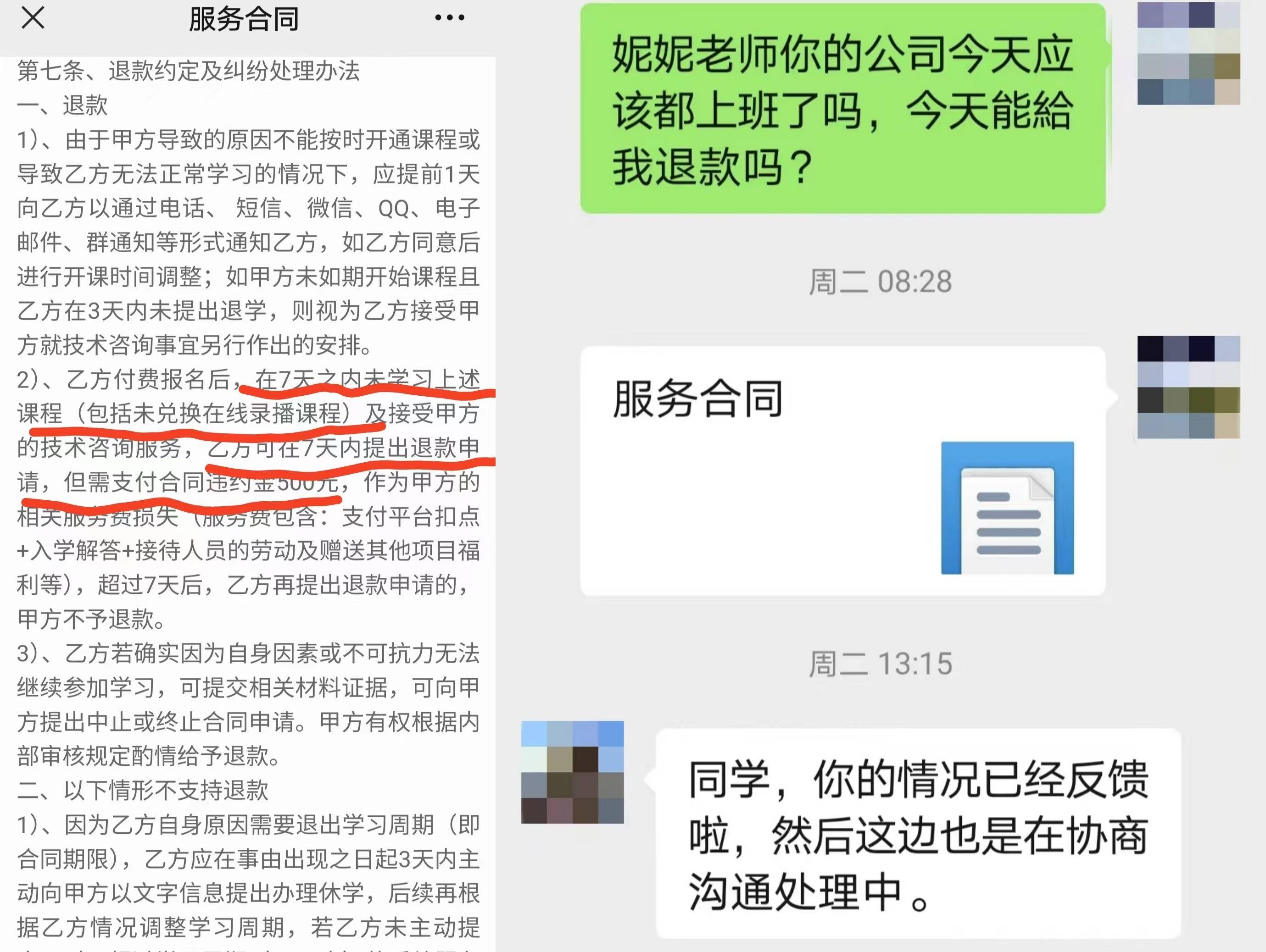 然而对方以课程已经发出为由拒绝退款。随后经多方协调,对方才勉强同意退回800元学费。