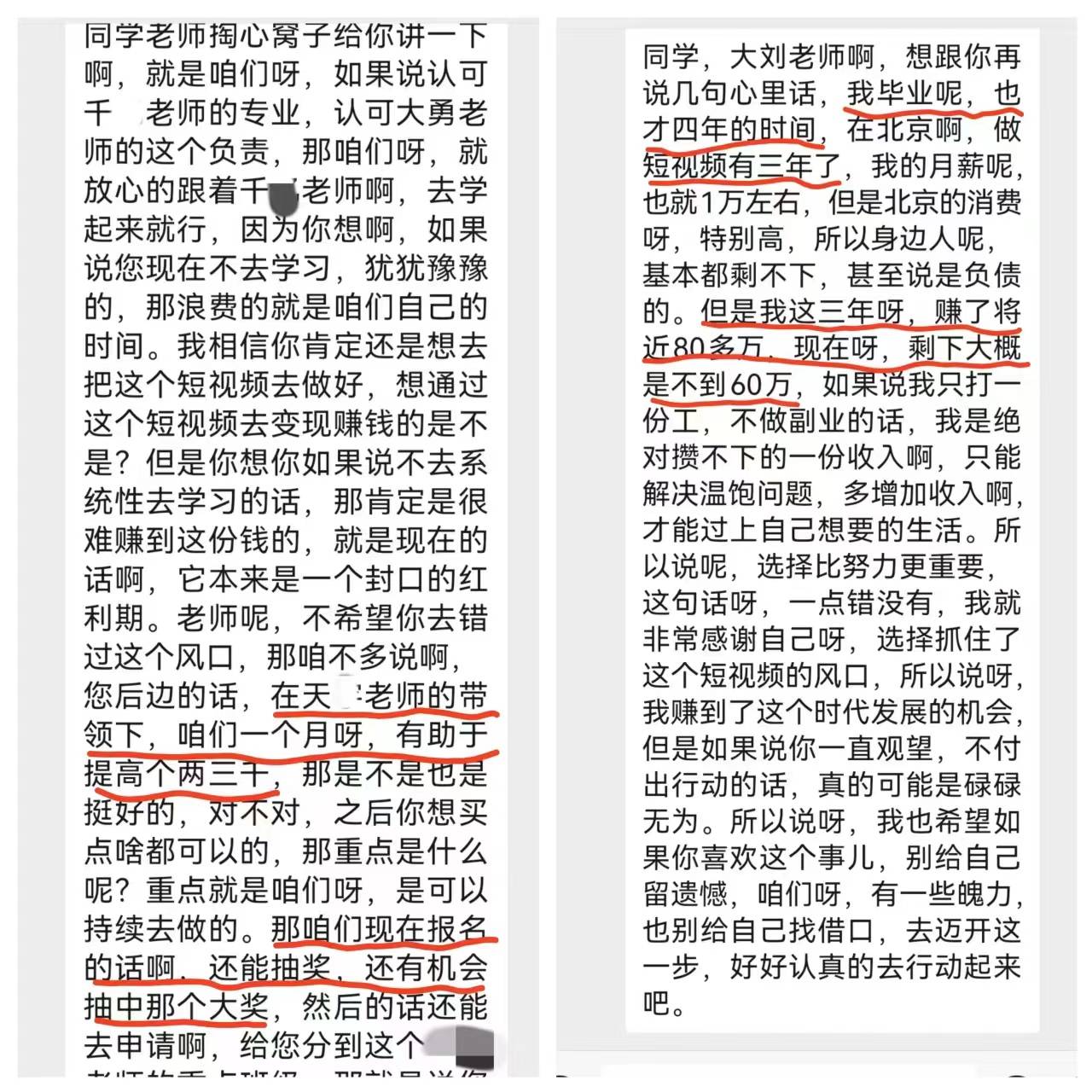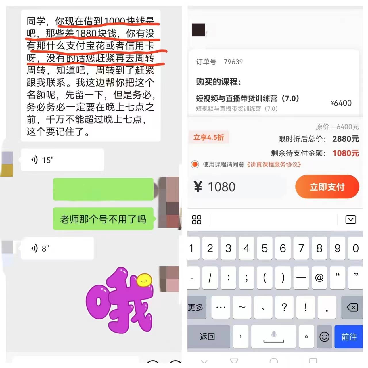 期间,“大勇老师”了解到杨女士家境不好,便称自己就是三年时间赚了80多万,同时“苦口婆心”地劝杨女士继续交纳2880元进入高级课程,一对一学习如何利用短视频带货补贴家用。
