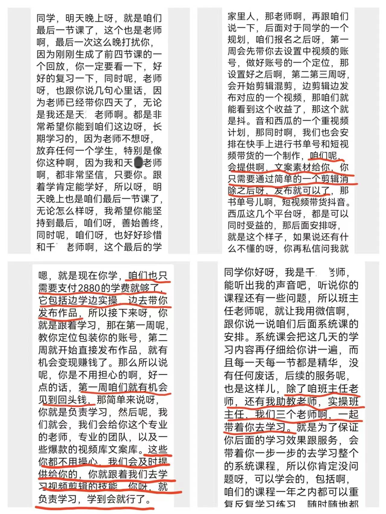 “老师,我交了2580元钱学短视频,他们当时说送1000粉丝,结果就听了两节课,不但什么都没送,连老师都找不到了……”