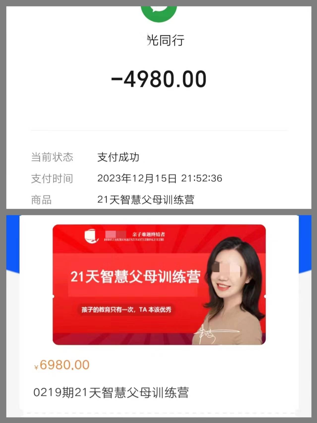 学习结束后,平台开始游说周先生继续参加一个21天智慧父母课程,称这21天的课程结束后,会在亲子关系、认知、生活、夫妻关系等各个方面都会有非常明显的提升。周先生觉得前面5天的课程老师讲得还可以,便缴纳了4980元学费。