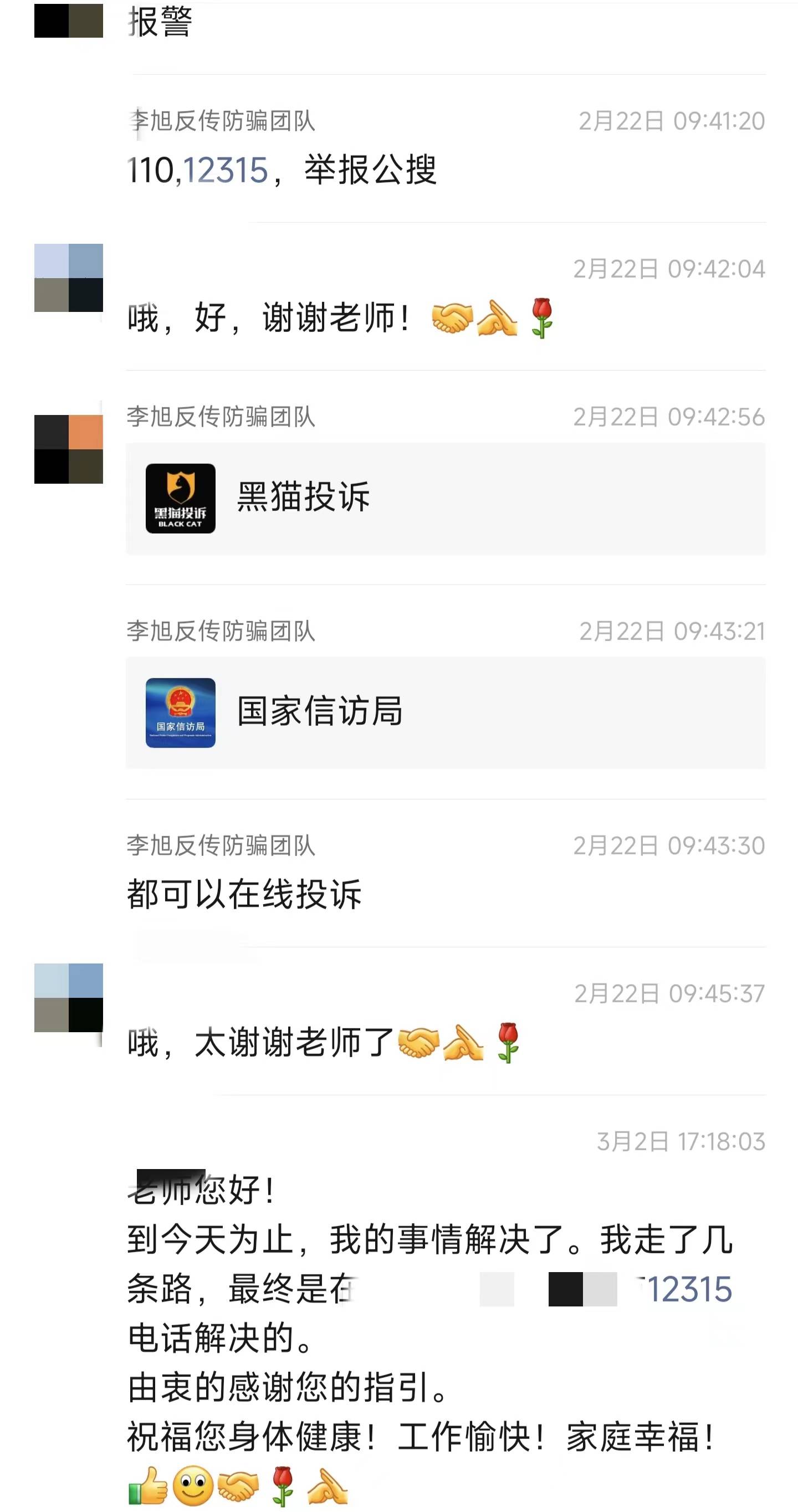 杨女士联系到李旭反传防骗团队,经团队指导,目前已经完成所有退费流程。
