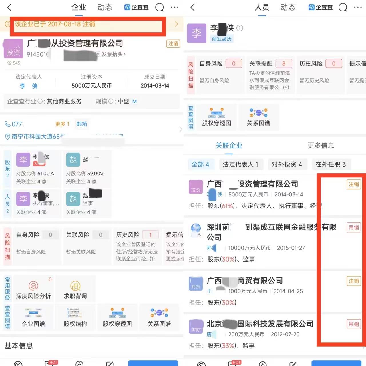 但是,根据企查查显示,与“YZ某”主理人“李某侠”有关的四家公司,不是被注销就是被吊销的状态。