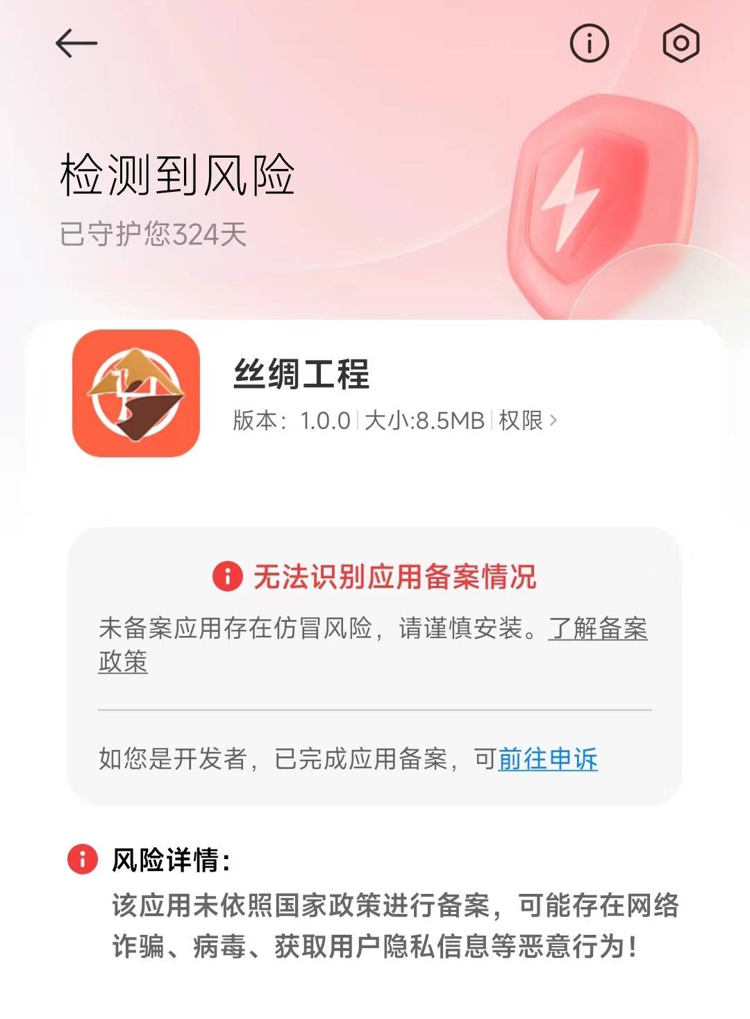 该诈骗APP无法通过正常的应用商城下线,需要内部链接才能下载,在安装时,手机会提示该应用未依照国家政策进行备案,可能存在网络诈骗、病毒、获取用户隐私信息等恶意行为!