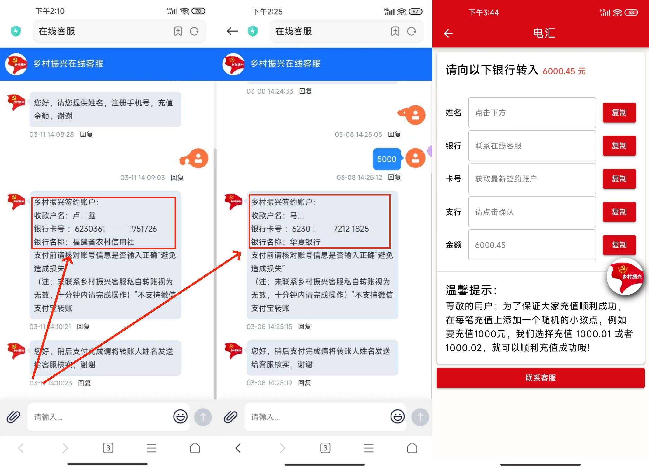 简单翻看该应该后发现,该应用充值时,只能通过“客服”发来的银行号转账,都是些第三方收款账户。