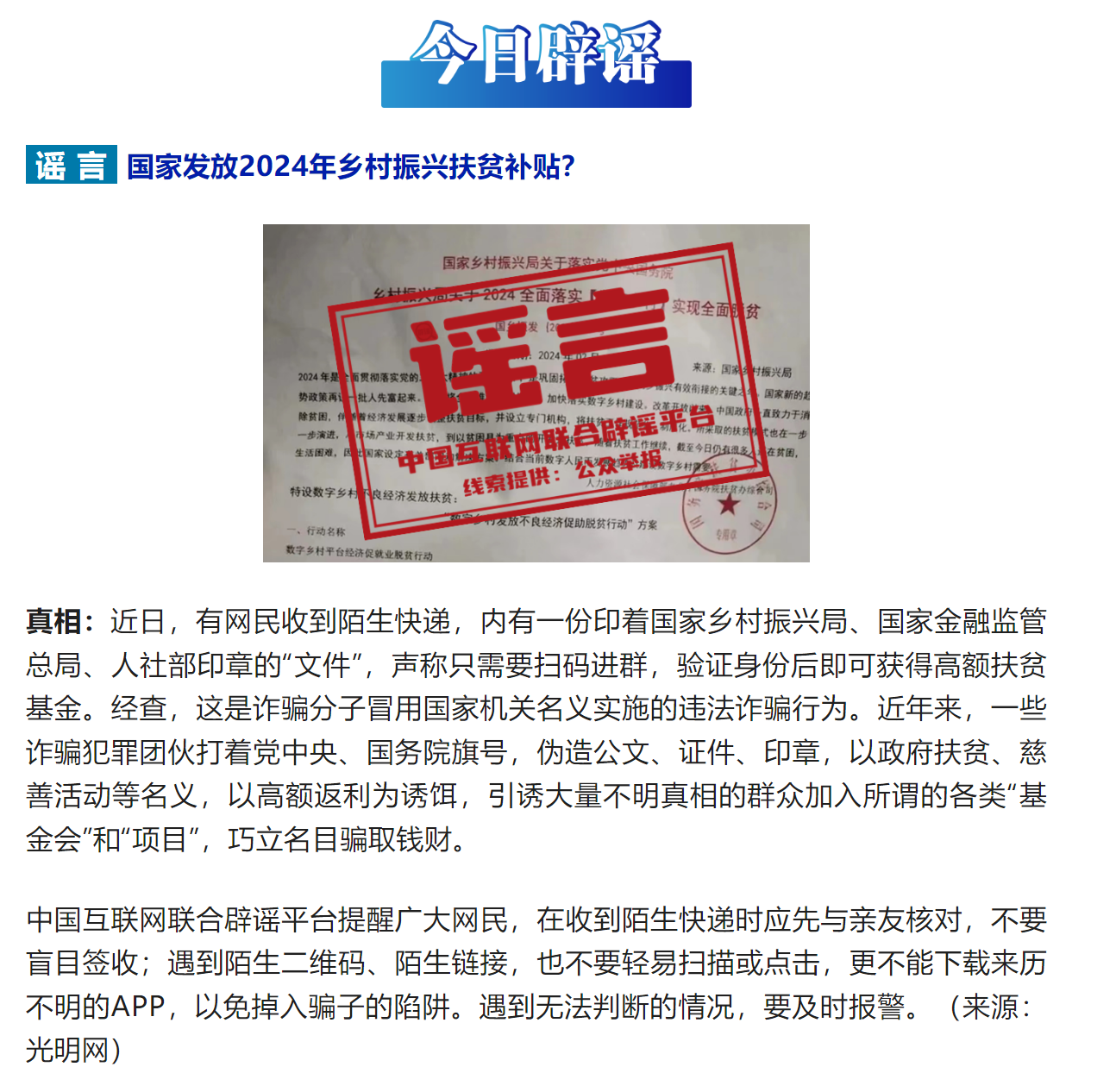 最近一段时间,网络诈骗团伙,多次打着国家乡村振兴的旗号实施电信诈骗,近日光明网发布一篇辟谣信息,声称有网友接到没收快递,内有一份印着乡村振兴局、国家金融监管总局、人社部印章的“文件”,经查,这是诈骗分子冒用国家相关机关名义实施的违法诈骗行为。