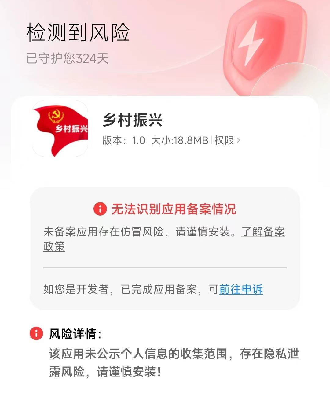 安装时,手机提示该应该未备案,存在仿冒风险,同时提示该应该未公示个人信息的搜集范围,存在隐私泄露风险,请谨慎安装。