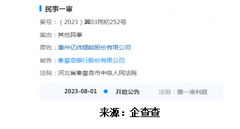 秦皇岛银行近期遭锂电龙头亿纬锂能起诉 二股东持股被冻结