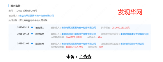 到底是什么纠纷,以至于秦皇岛银行的二股东受到影响,法院和银行的相关公告未披露。企查查汇总的信息显示,开发区国资经营公司近两年卷入金额最大的纠纷是因金融借款合同纠纷,被哈尔滨银行天津分行所连带起诉。2021年天津市二中院做出判决,要求秦皇岛泰盛建设发展有限公司偿还对哈尔滨银行天津分行共计8.5亿元的借款本息罚息等、开发区国资经营公司对上述债务承担连带保证责任。审理期间,法院冻结了开发区国资经营公司持有的秦皇岛银行4.25亿股、对应价值9亿元。(注:工商信息显示,开发区国资经营公司、秦皇岛泰盛公司的控股股东都是秦皇岛经济技术开发区管理委员会)