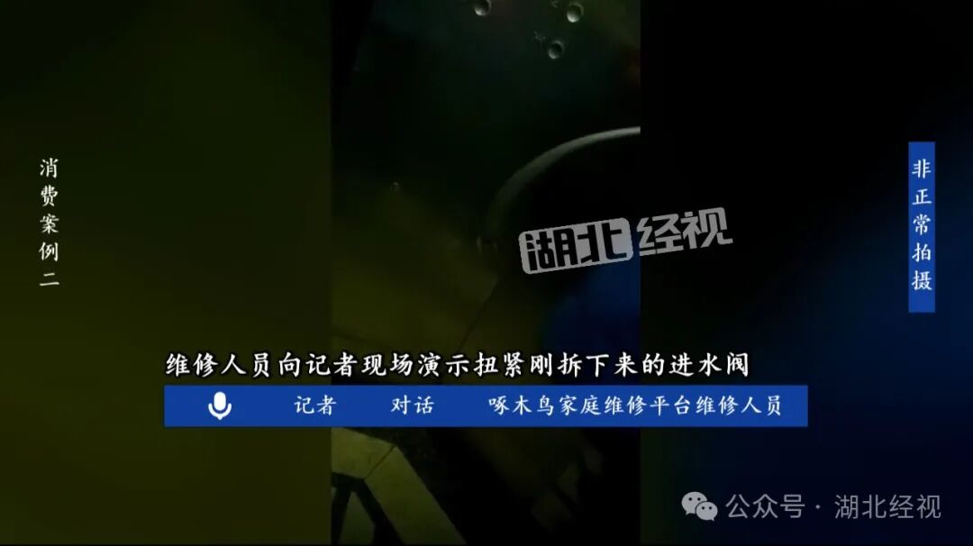 真的如此吗?维修人员更换了马桶进水软管和进水阀,并进行了疏通,马桶不再漏水,冲水也更加强劲顺畅,消费者对此十分满意。然而,湖北经视记者却从中发现了问题:消费者家中马桶原装品牌进水阀,被维修人员拆下带走,换上了一只廉价进水阀。