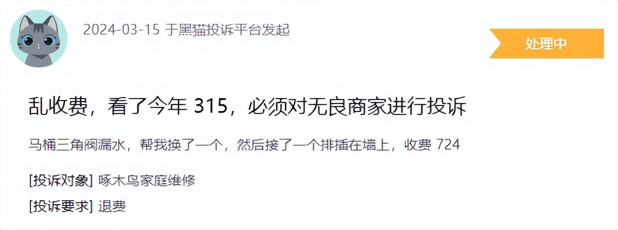 一位网友投诉称,马桶三角阀漏水,啄木鸟维修师傅帮其换了一个,然后接了一个排插在墙上,收费724元。