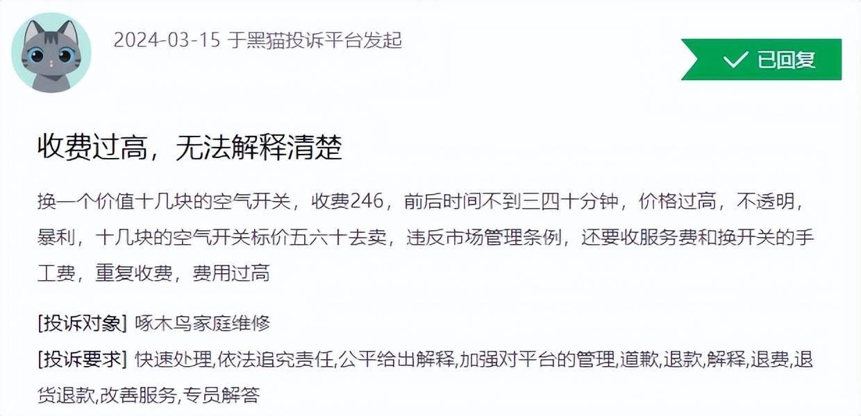 另一位网友投诉称,换一个价值十几块的空气开关,啄木鸟收费246元,前后时间不到三四十分钟,价格过高,不透明,暴利,还要收服务费和换开关的手工费,重复收费,费用过高。