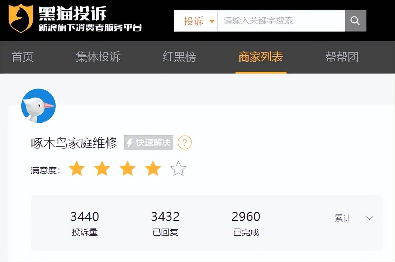 天天消费发现,黑猫投诉平台上,啄木鸟家庭维修投诉量达3440条,问题涉及乱收费、收费过高、重复收费、收费不透明等。