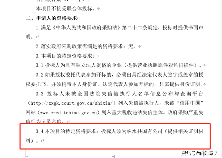 近日,响水一家成立不足4个月的公司顺利中标数亿元项目,然而招标文件对投标人需为“当地国有公司”,拒绝民企投标的特定要求遭到质疑。