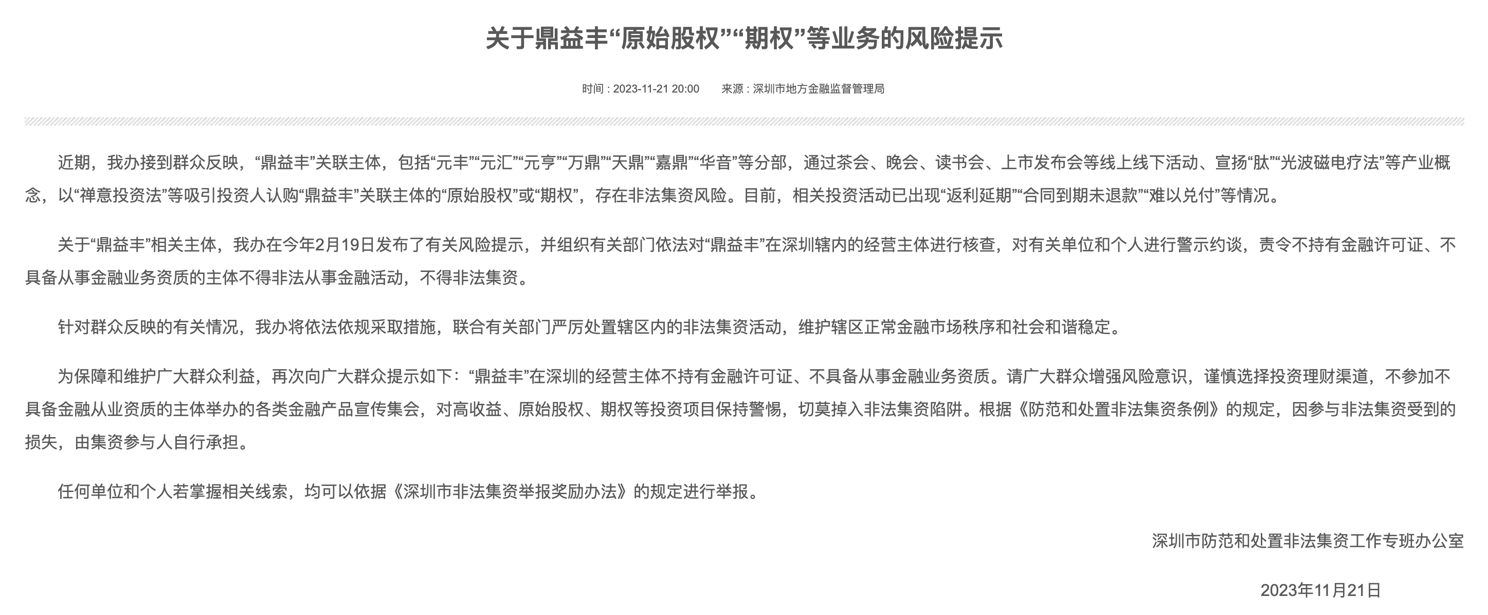2023年2月发布的风险提示称,“鼎益丰”关联的主体众多,且分布在全国各地,在深圳的经营主体不持有金融许可证、不具备从事金融业务资质。同年11月发布的风险提示称,该监管部门接到群众反映,“鼎益丰”关联主体,包括“元丰”“元汇”“元亨”“万鼎”“天鼎”“嘉鼎”“华音”等分部,通过茶会、晚会、读书会、上市发布会等线上线下活动、宣扬“肽”“光波磁电疗法”等产业概念,以“禅意投资法”等吸引投资人认购“鼎益丰”关联主体的“原始股权”或“期权”,存在非法集资风险。目前,相关投资活动已出现“返利延期”“合同到期未退款”“难以兑付”等情况。