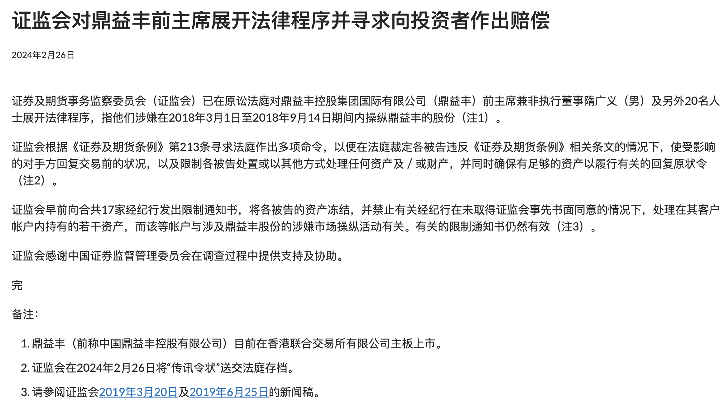 2月26日,香港证监会发布的新闻稿称,已在原讼法庭对鼎益丰控股集团国际有限公司(鼎益丰控股,00612.HK)前主席兼非执行董事隋广义及另外20名人士展开法律程序,指他们涉嫌在2018年3月1日至2018年9月14日期间内操纵鼎益丰的股份。