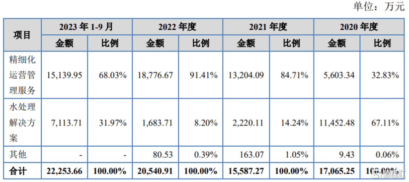 根据为客户提供服务的类型及废水处理的服务阶段,公司对应的产品及服务可以分为水处理解决方案和精细化运营管理两大类。2020年至2022年,今大禹精细化运营管理服务的营收占比从32.83%大幅提升至91.41%,水处理解决方案的营收占比明显下滑。